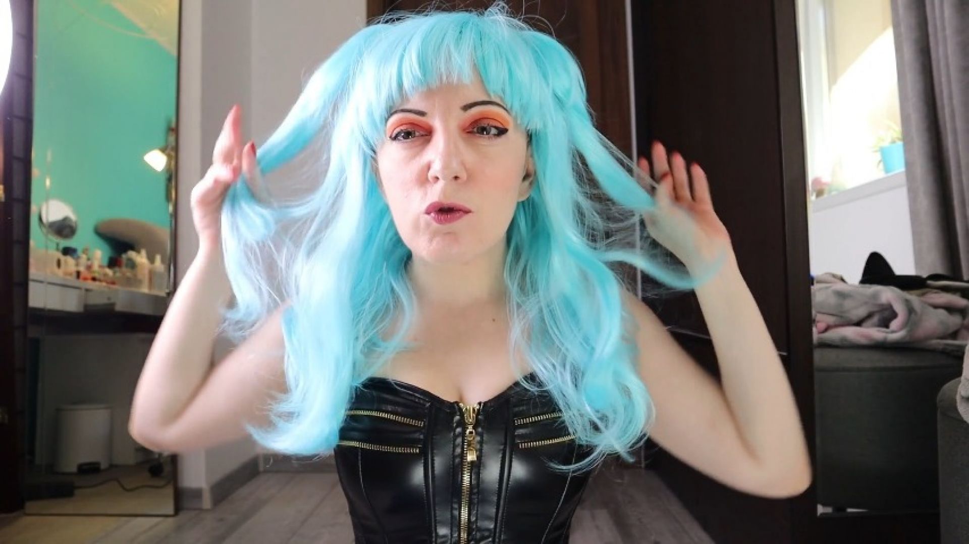 Blue nylon pantyhose, wig, leather corset, high heels video.