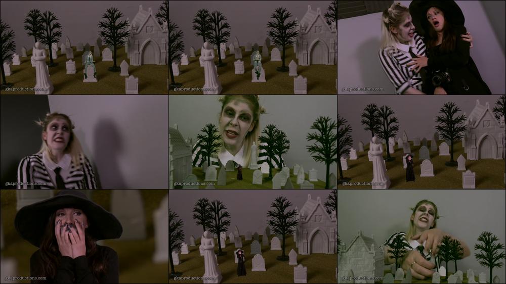 Lydia (Ashlynn Taylor) walks about her new house, dressed in all black & taking photos of everything. Lydia takes photos of a miniature graveyard and noises something strange in the photos. Lydia looks harder at the tiny graveyard, and sees Beetlebitch (Nikki Brooks) sitting on a grave. “Are you alive?” Lydia ask the tiny pale woman. Beetlebitch tells Lydia she has to let her out of the tiny graveyard…and all she has to do is say her name three times. Beethbitch convinces Lydia, and she says it - releasing Beetlebitch. Beetlebitch grows to normal size, and starts to kiss and grope Lydia. Beetlebitch shrinks Lydia & seals her mouth shut. She has her fun - then eats Lydia whole! (Custom Clip. Interested in commissioning a custom clip with Ashlynn or Nikki? Email us today.)