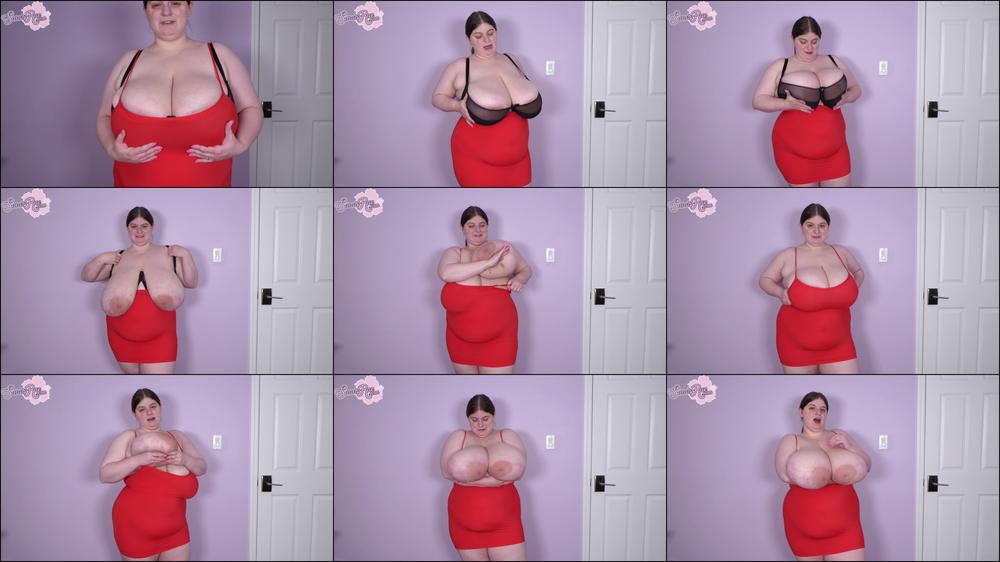 Showing off my dress and bra that are too small for me. My bra is a 38 O Cup, which was the largest size Curvy Kate carried at the time I bought it. I take off the bra and show you the tags. I talk about how my boobs don't fit into anything and how I need a seat belt extender for my car in order to drive around with my massive tits. I put my tits back in my dress and bounce around in it braless. Then I take them back out and show them to you while you cum.