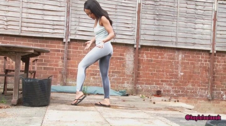 So annoying, I have to do the gardening but I need a wee!! I need to sweep, tidy up, and bend down a lot to get the garden tidied, which makes me even MORE desperate!! I need to finish the gardening so have to hold my bladderβ¦ But I canβt hold it any longer!! I end up peeing myself, in my leggings! Soaking them right through, wow what a big pee! It changes the colour of my leggings drenching them, my feet, and leaves a massive puddle running all over the ground. I show off the wetness to you, feeling how soaked my leggings are, pee dripping off my feet