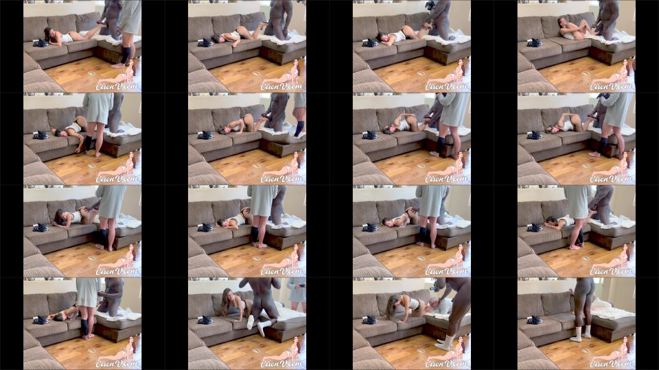 Then the cuckold husband, also the cameraman is told to come clean up Louie’s hot black sperm from his wife’s feet. Hubby does as he is told and slurps up all that hot balck seed. Louie helps him finish the job buy grabbing cucky by the back of the next and pushing his face into that Superior black jiz.