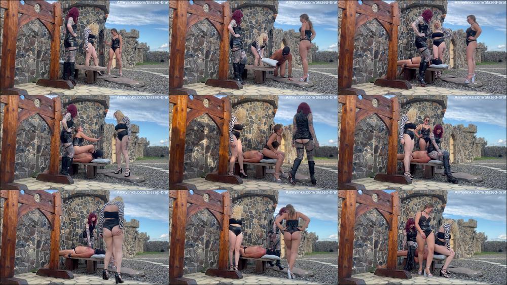 In the yard at Dracula femdom castle myself, mistress stapana zeida and princess mia decide to get a slave out of the prisons to have fun with! He's a little slow and not very smart with our demands at least he's entertaining he starts by greeting us and worshipping our feet kissing each foot before we tell him to lie down on the stone table so we can comfortably sit on his face. we each take turns bouncing and making it an uncomfortable table for him to be lying down on.