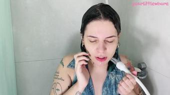 I start wearing a dry diaper. I put on a jeans skirt and go to the shower. I wet my diaper with water and it gets very full and squishy. I wet my socks too. I walk around showing off my wet diaper. I sit and hump my pussy against it, it feels so warm and soft. I then to back to the shower, remove it, and wet my skirt, blouse, hair and face. I finger myself in different positions while I'm soaked. I remove my clothes in the end and show off my completly wet body.
