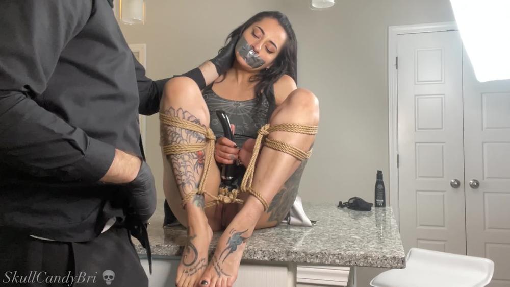 Bri's boyfriend got involved with the wrong people. Unable to pay a debt, he abandons her in their apartment knowing that people are on their way to collect his debt. A masked intruder appears from behind Bri, binding her up with ropes and cuffs. It becomes apparent that this intruder has a foot fetish and makes Bri worship her own feet. Becoming turned on herself, Bri offers to connect with this intruder in a more intimate way. By her request, he gags her, and fucks her feet until he explodes all over them.