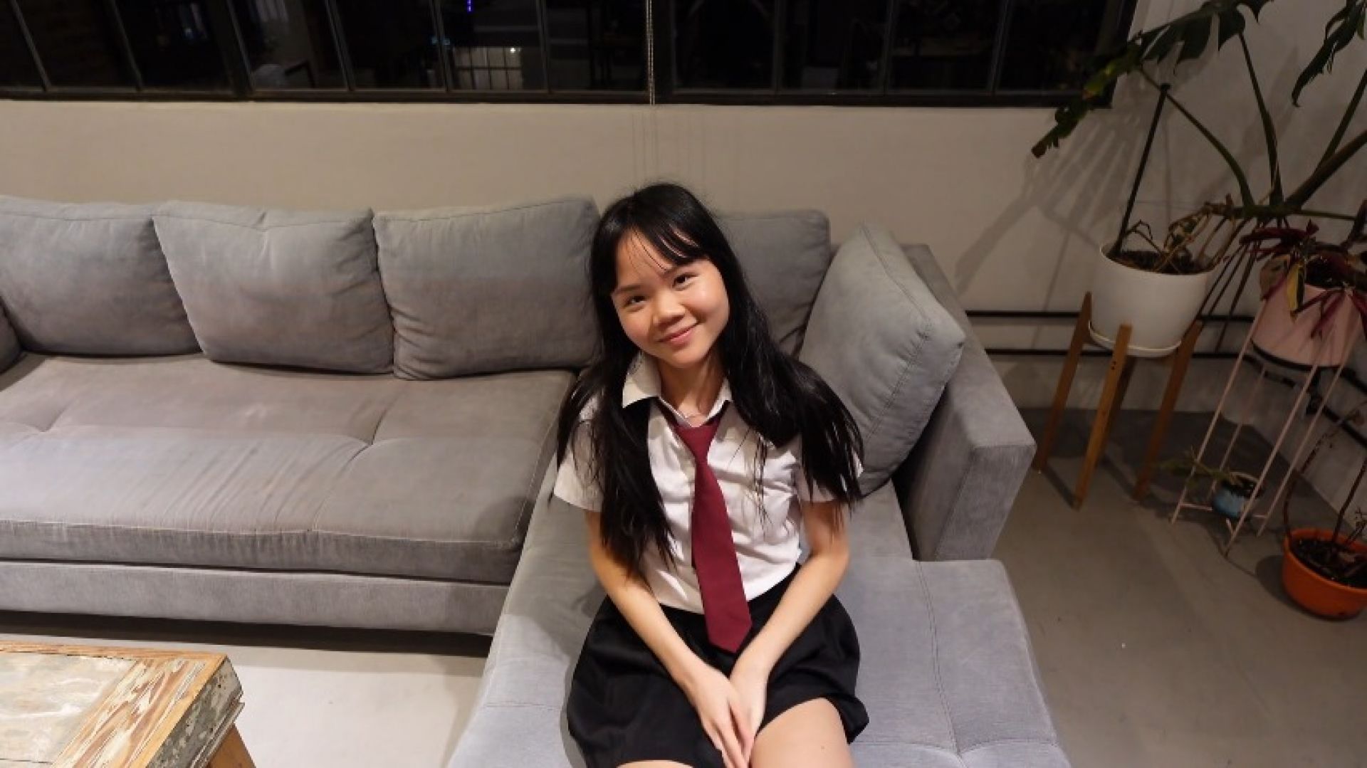 Asian teen student Baebi Hel finds something interesting to play with in her stepdad's pants