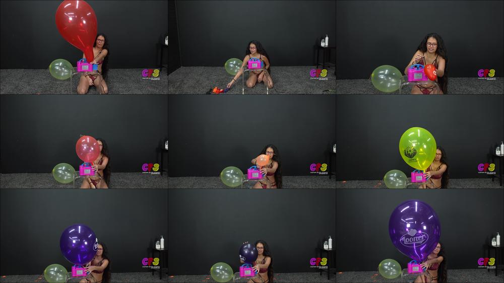 Petite Angel has very long hair and is going to pump to pop several balloons. She is a little nervous about doing it because she doesn't know what to expect. She has no problem blowing the balloons till they get really great necks and finally explode. She re-inflates a yellow Happy Burstday balloon but ponders whether to let it go and fly around the studio instead of popping it.